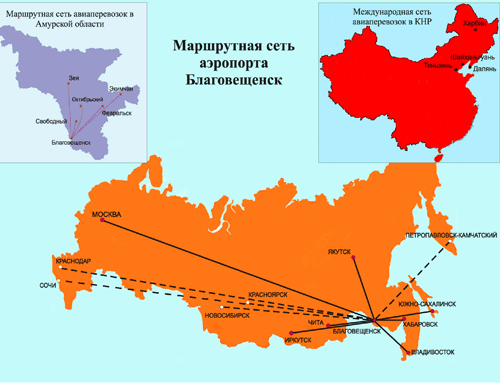 В настоящее время из аэропорта Благовещенск выполняются полеты в следующие города: